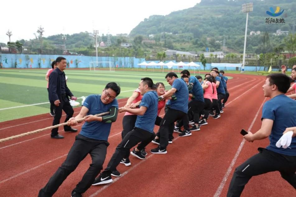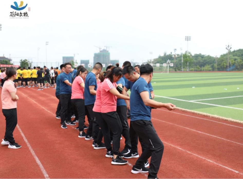 隨著哨聲一響,我們雙手握緊長繩,咬緊牙關(guān)向后拉,為了把握節(jié)奏形成合力,心里默念著“一二、一二”,場上一時僵持難下,但難敵強(qiáng)悍對手,第一局廣源達(dá)勝。這仿佛符合多數(shù)人的預(yù)期,但我們怎會被拘于這固定印象,越戰(zhàn)越勇才是符陽文旅人的風(fēng)姿。第二場對決比第一場更加艱難,一開場廣源達(dá)占據(jù)絕對優(yōu)勢,我們險(xiǎn)被拉到了終線,全憑一口氣死撐,牙關(guān)咬緊,身體后傾,不斷降低重心,腳步穩(wěn)扎,做著別人眼里無畏的掙扎。一定不能越線!在超高壓下堅(jiān)持了十余秒,那一刻拼的就是韌勁!一群瘦弱的文旅人憑著一股拼勁慢慢把賽場主動權(quán)掌握在了自己手中,每向后移動一步,心里的勁更足了,如荒漠迷路的旅者遇見了綠洲,我們也尋得了力量之源。當(dāng)現(xiàn)場歡呼聲響起時,我們已癱坐一片,不敢置信,我們贏啦!