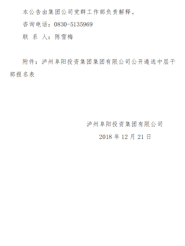 瀘州阜陽(yáng)投資集團(tuán)集團(tuán)有限公司關(guān)于面向全集團(tuán)公開遴選中層干部的公告