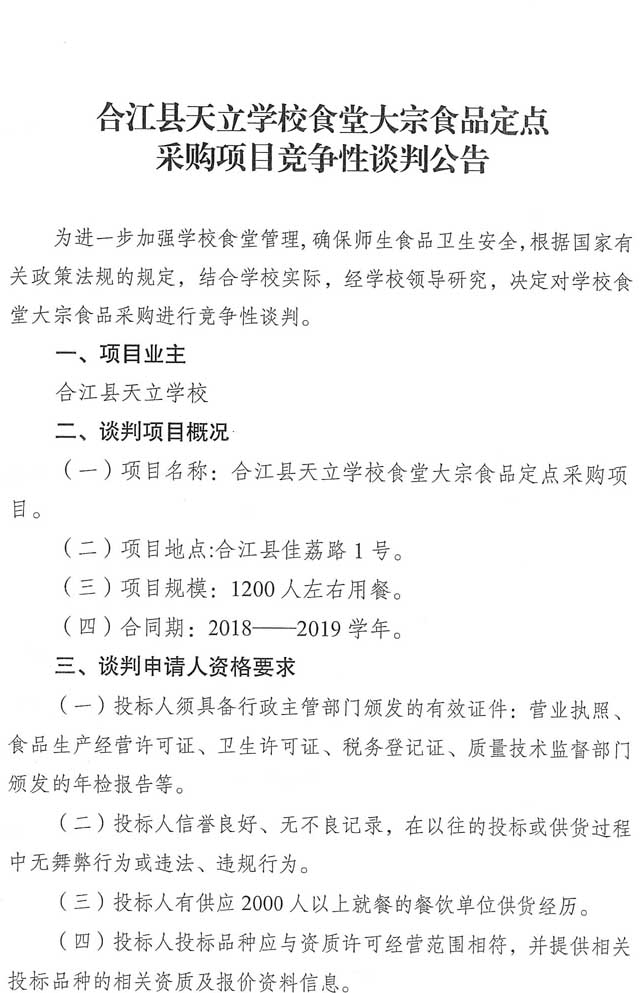競爭性談判公告:合江縣天立學(xué)校食堂大宗食品定點(diǎn)采購項(xiàng)目競爭性談判公告