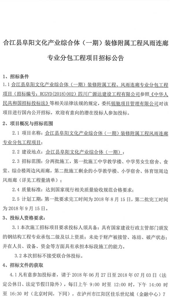 合江縣阜陽文化產(chǎn)業(yè)綜合體(一期)裝修附屬工程風(fēng)雨連廊專業(yè)分包工程項(xiàng)目招標(biāo)公告.doc