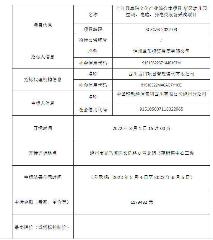 合江縣阜陽(yáng)文化產(chǎn)業(yè)綜合體項(xiàng)目-新區(qū)幼兒園空調(diào)、電腦、弱電類設(shè)備采購(gòu)項(xiàng)目公開(kāi)招標(biāo)中標(biāo)結(jié)果公告